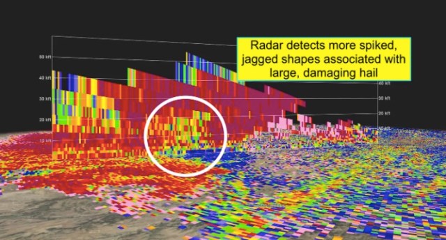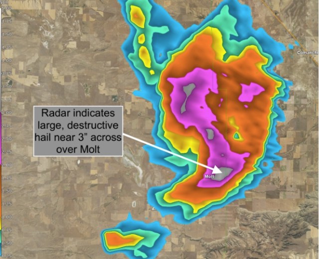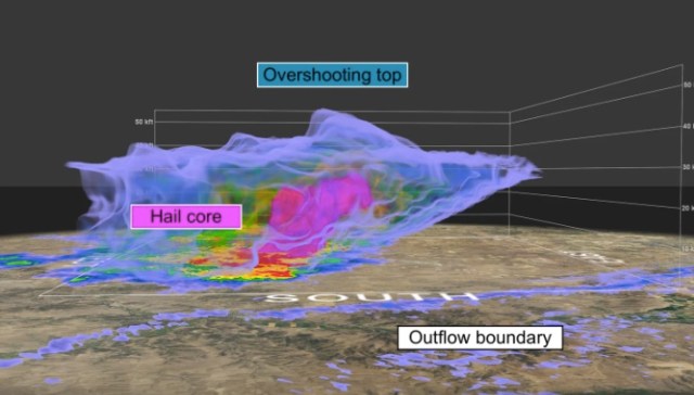 Doppler radar estimated hail size topping three inches near Molt. This 3-D volume rendering of the storm shows the hail core, highlighted in pink, stretching to 30,000 feet. That’s an extremely impressive core. An overshooting top can be seen above the hail core, the bubbling storm top indicative of an extremely strong updraft.